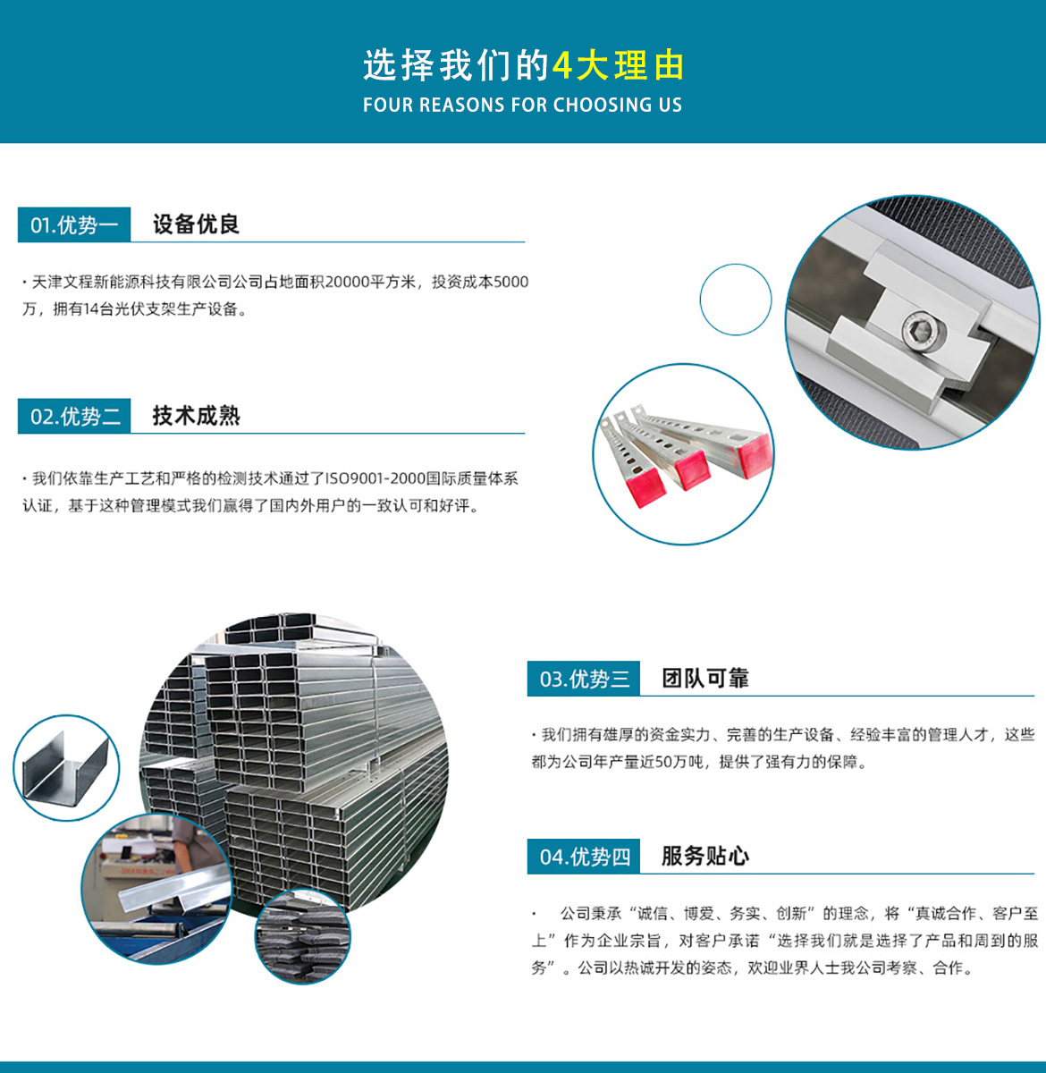 天津文程新能源科技有限公司成立于2021年,是專注于集中式、分布式、漁光互補(bǔ)和農(nóng)光互補(bǔ)等清潔能源發(fā)電的綜合性企業(yè) 公司是集設(shè)計(jì)、研發(fā)、生產(chǎn)、制造為一體的綜合型企業(yè)。公司占地面積20000平方米,注冊資金5000萬元整。公司坐落于華北鋼鐵重鎮(zhèn)--大邱莊,距天津市區(qū)50公里、鄰104和205國道及京滬高速,交通十分便捷。 本公司擁有三個(gè)生產(chǎn)車間,其中兩個(gè)冷彎型鋼車間,一個(gè)鋅鋁鎂型鋼車間,擁有自動冷彎成型機(jī)10條,自動數(shù)控沖孔機(jī)10條以及焊接加工等設(shè)備。主要生產(chǎn)產(chǎn)品有:太陽能光伏支架、各種規(guī)格的C/Z/U型鋼、抗震支架、管廊支架及整套配件等。